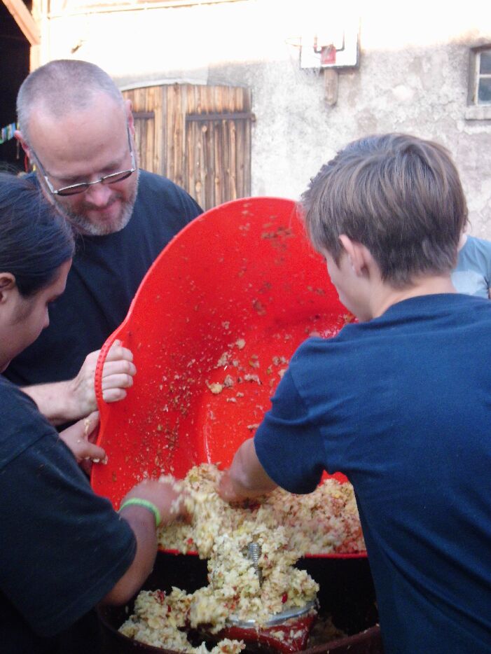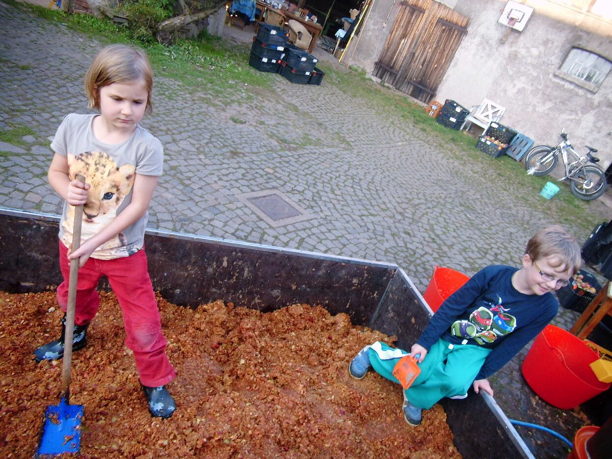 Anschließend geht es zu Familie Tuschy auf den Färberhof in Ilfeld. Hier steht eine Apfelsaftmaschine, die mithilfe von Wasserdruck den Saft aus den Äpfeln presst. Dieser wird erhitzt und in Zehnlitersäcke abgefüllt. So bleibt er haltbar und die Kinder und Jugendlichen vom KILA können das ganze Jahr davon trinken.