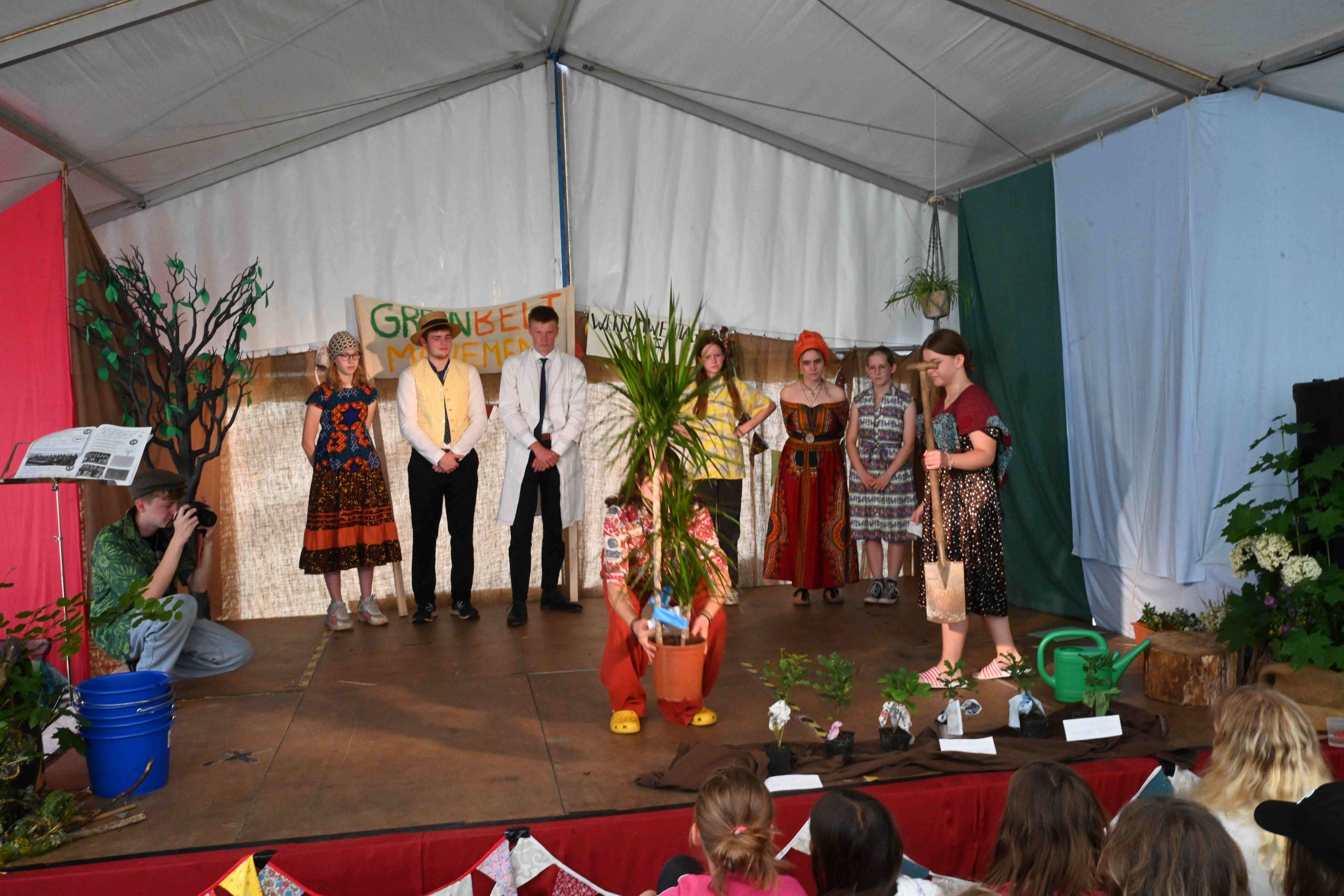Heute weckt uns das „Blöken“ vieler Schafe, die direkt neben uns ihre Weide bezogen haben. Sie sind früher aufgewacht als wir, und nun hält auch uns nichts mehr im Zelt. Das Frühstück im großen Zelt gehört zu den tollsten Erlebnissen im Camp. Da sind wir alle beisammen! Einige munter und voller Tatendrang, die anderen verschlafen und etwas knurrig, die Älteren unter uns begierig auf Kaffee und wieder andere freuen sich einfach nur auf die leckerste Schokocreme der Ferienzeit. So gestärkt erwarten wir das Theaterstück. Wangari versucht, dreifache Mutterschaft und Arbeit unter einen Hut zu bringen. Sie hat als erste Frau in Ost- und Zentralafrika einen Doktortitel erhalten und arbeitet mit Herz und Seele am University College of Nairobi. Für Mwangi, ihren Mann ist es schwierig in der Männerdominierten Umwelt zu seiner selbstbewussten, gebildeten Ehefrau zu stehen. Seine Kollegen und Parteifreunde verbergen nicht, dass sie ihn verspotten wegen seines Verständnisses für diese Frau. Das geht nicht spurlos am Familienfrieden der Maathais vorüber. Aber Wangari lässt sich nicht zurückhalten. Sie arbeitet unter anderem aktiv in einer Frauenvereinigung zum Umweltschutz mit. Dort entwickelt sie eine Idee, den verheerenden Auswirkungen der Bodenerosion und somit der Ausbreitung der Wüstengebiete auf vorhandene Vegetationszonen, entgegenzuwirken. Ganz einfach findet sie Lösungen für Probleme, die unlösbar scheinen. Bäume pflanzen, da wo der Mensch zerstörerisch eingegriffen hat. Bäume pflanzen mithilfe von Menschen, die in diesen Gebieten leben und damit deren Lebenssituation verbessern. So ist schnell der Plan gefasst Hunderte, ja Millionen Bäume zu pflanzen. Mithilfe der Organisation und ihrer Freundinnen wird die „Green Belt Movement“(Grüngürtelbewegung) Organisation ins Leben gerufen. Beim Weltumwelttag 1977 findet eine Baumpflanzaktion statt, bei welcher sieben Bäume zu Ehren von sieben Persönlichkeiten gepflanzt werden. Diese gehören zu den verschiedenen Ethnien Kenias welche in den letzten Jahrhunderten gelebt haben. Organisiert wurde dies von „Save the Land Harambee“ .Wangari und „Green Belt Movement“ führten dies durch. Eine Aktion, die durch die Presse ging, und den Beginn des ersten „grünen Gürtels“ darstellt. Wangari tritt nun immer mehr in die Öffentlichkeit. Sie eröffnet Baumschulen in denen Setzlinge gezogen werden, um dann im großen Maße in weit verbreiteten Gebieten gepflanzt zu werden. Nach dem Motto: „Ein Mensch, ein Baum!“ Für Wangari unendlich viel Arbeit, jedoch auch Erfüllung. Aber, kann ihr Mann dies alles mittragen? Bei den Pflanzungen treten Probleme auf, die dringend nach einem neuen Konzept verlangen. Wieder findet Wangari neue Lösungsansätze, doch auch das fordert ihren ganzen Einsatz …