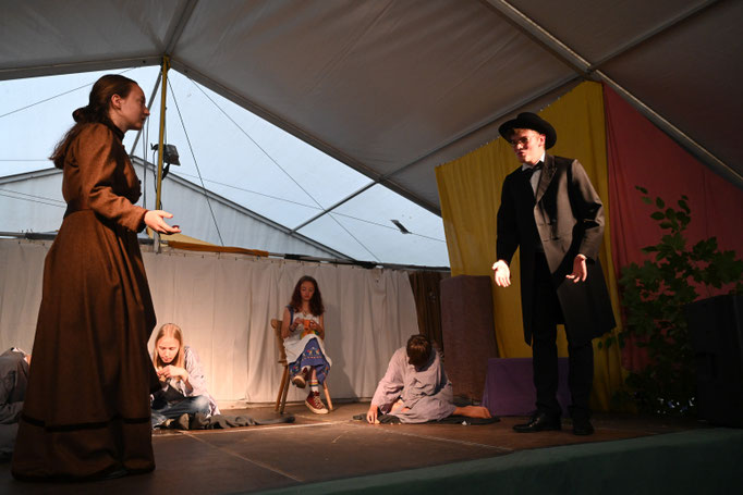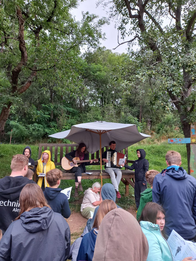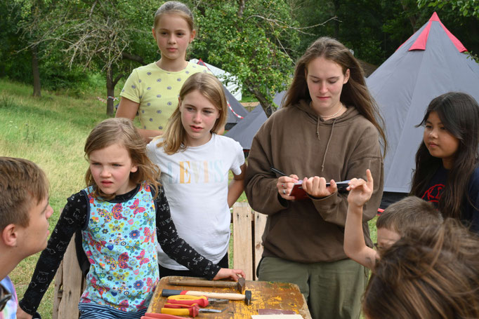 Ein gutes Gefühl gibt der gewohnte Start in den Tag mit der Morgenandacht am Kreuz. Wir genießen die Morgenluft, bedenken die Worte und singen gemeinsamen Lieder. Eine neue leckere Sache gib es zum Frühstück – NUDOSSI satt! Die leckere Nusscreme wurde für das diesjährige Camp von der „Sächsischen und Dresdner Back- und Süßwaren GmbH & Co KG“ gespendet, und alle großen und kleinen Handwerker genießen diese in vollen Zügen! Auch heute begeben wir uns im Theater wieder auf die Spuren von Maria Montessori. Mit glühendem Eifer und auch einiger Überwindung schafft sie 1896 ihr Examen in Medizin und somit ist sie die erste Ärztin Italiens. Große Ehre wird ihr zuteil und sie erreichen sogar Gratulationen von der Königin Margarethe. Doch Maria verliert nicht ihr Ziel aus den Augen. Sie leistet Freiwilligendienst in den Elendsvierteln. Nun kann sie endlich richtig helfen! Sie achtet nicht auf den Stand der Menschen, der Mensch selbst ist ihr wichtig. Ihre erste Arbeitsstelle tritt sie in der Psychiatrischen Klinik in Rom an der Seite von Professor Montessano an. Sie ist entsetzt von den Zuständen die dort herrschen. Voller neuer Ideen und ungestümen Tatendrang macht sie sich an die Arbeit, um die Lebensumstände besonders der kleinen Patienten zu verbessern. Im Anschluss gab es wieder die Bibelarbeit, eine gute Gelegenheit für Gespräche miteinander.