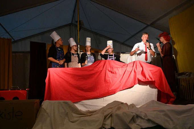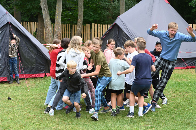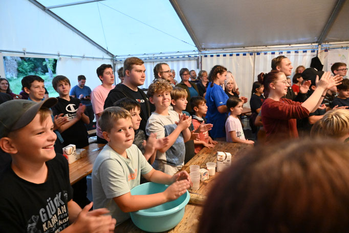 Ebenso großen Tatendrang verspüren wir in der Handwerkszeit am Nachmittag. Da streifen zum Beispiel die „Quetschies“ durch die Wiesen auf der Suche nach seltenen Pflanzen für ihre Herbarien, während die „Fährbootenen“ ein passendes Stück Rinde in schnittige Bootsform fräsen. Die „Aufsteiger“ hämmern fleißig an ihren Aufstiegshilfen. Erstaunlich vbielseitige „Maskipizzarazzis“ entfalten großartige Kreativität beim Masken gestalten, verzaubern den ganzen Platz mit leckerem Pizzaduft und bringen dies auch noch in der neuesten Campzeitung zu Papier. Wen wundert es da, dass am Abend der Appetit so groß ist, dass ins große Zelt zu einer einmaligen großen „Kochshow“ geladen wird! Zu Ende geht der Tag wie gewohnt mit Klängen der Taizelieder.