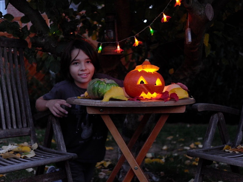 Die Kürbisse werden dazu erst ausgehöhlt und bekommen gruselige Gesichter geschnitzt und werden dann gern mit Teelichtern vor der Haustür aufgestellt. Aus dem verbleibenden Rest kochen wir mit Äpfeln das Kürbis Gericht, an dem sich nach getaner Arbeit natürlich satt gegessen werden kann.
